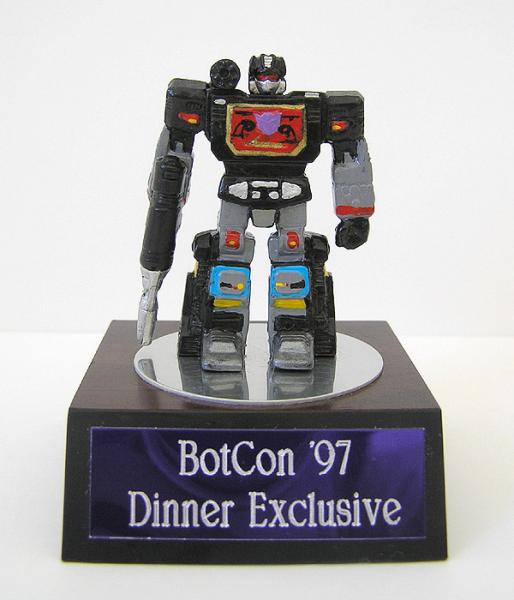 On July 18-20 1997 in Rochester, New York, was held one of the most famous convention of the TF world: BotCon. As usual several exclusives were produced, a Beast Wars redeco two-pack of Fractyl/Packrat in their Energon armours, a T-shirt and a CD too! But there was another, a dinner exclusive given to the first 100 attendees at the pre-convention dinner on friday night. It was a small white box with a little treasure inside! A decoy hand painted by the artist Dave Van Domelen, a stand with a plaque (red or purple) with 'BotCon 97 Dinner Exclusive' words engraved and a laminated panel showing a storyboard from 'The Transformers: The Movie'. Each one came in various deco: solid gold, G1 toy colors, G1 TV show colors and even battle damaged colors! 4 years ago I managed to obtain 2 of these exclusives decoys and I must say that they are very beautiful and carefully painted. The first one is an iconic character Soundwave in his 1987 japanese redeco as Soundblaster And here we have one of the Insecticons: Kickback in his TV show colors I have another surprise about decoys, but the stars aren't properly aligned yet so you have to wait a little...